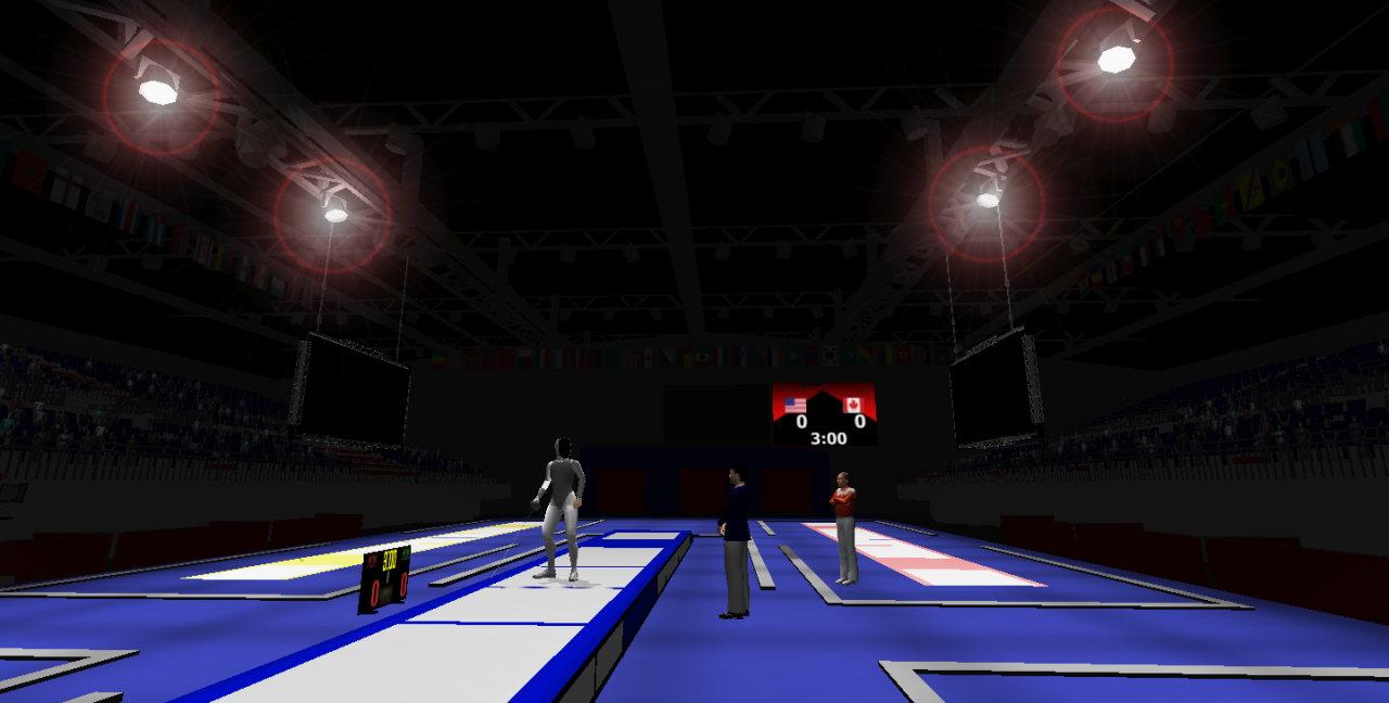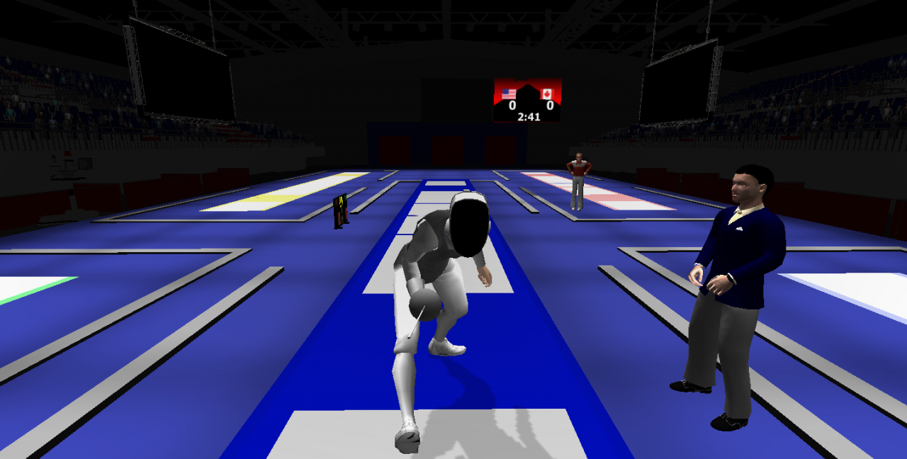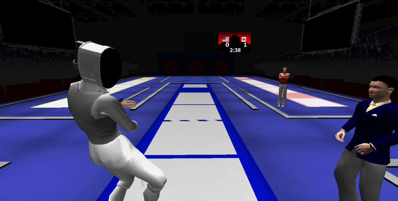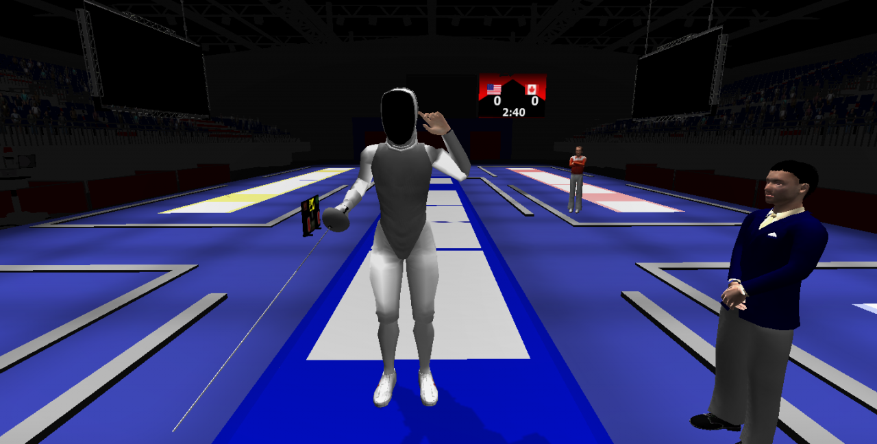 Essentially, clients are experienced fencers who wish to work on certain aspects of their sport. This virtual fencing arena provides convenient exposure to a competition-level environment where clients can focus on breathing, mental preparation & getting "in the zone", as well as responding to events occurring during a match, etc. The primary feature of the simulation is the Opponent: a customizable virtual antagonist that offers options for gender, handedness (lefty vs righty), nationality, and behavior. There is also a virtual Director, present to officiate and perform all necessary calls during the match.